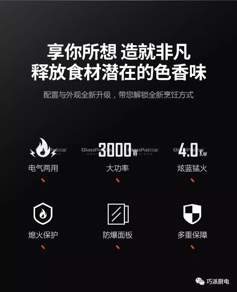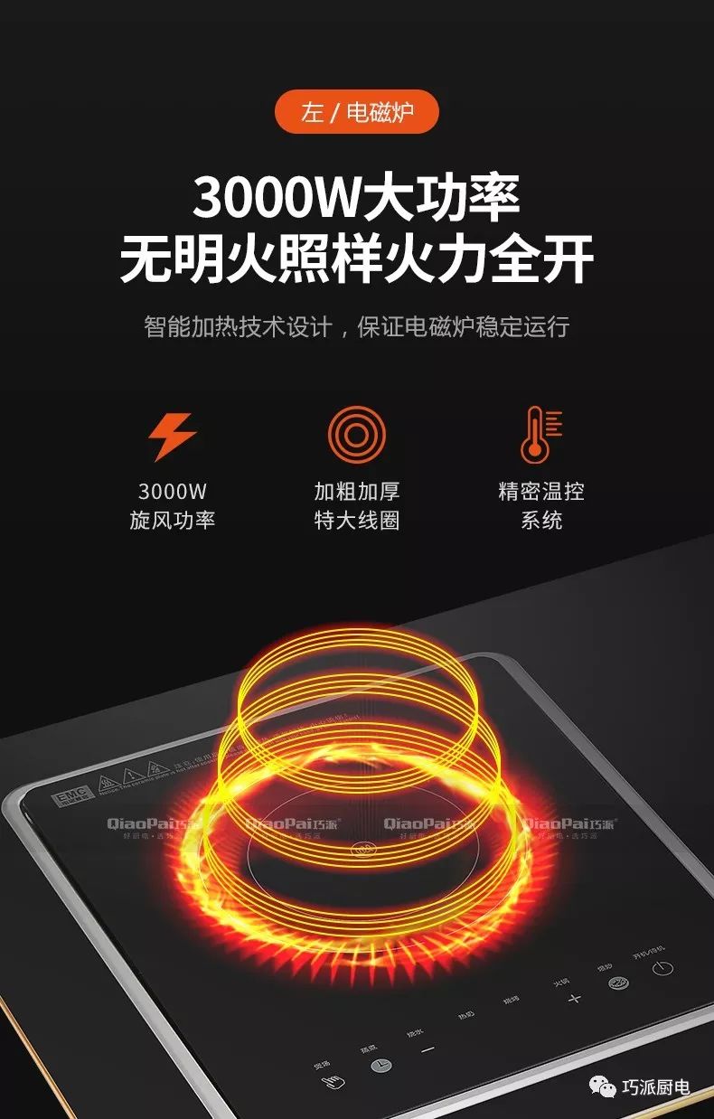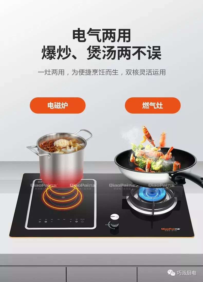 電磁爐灶和燃?xì)庠铍p灶組合,沒氣用電,沒電用氣,滿足煎、炸、煮、燉多種烹飪需求,一家人盡享多種美味。