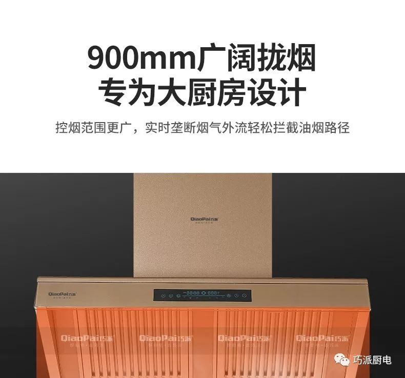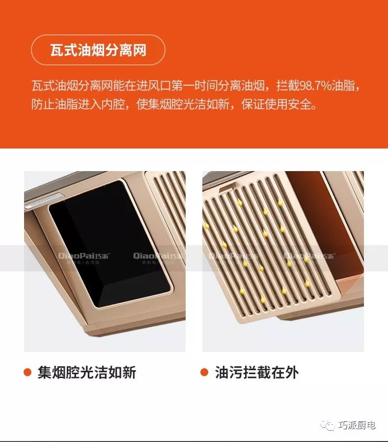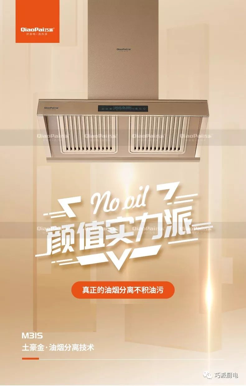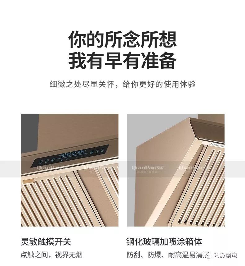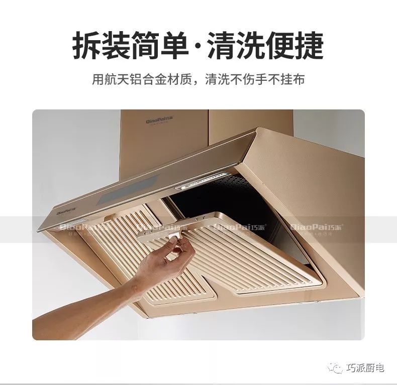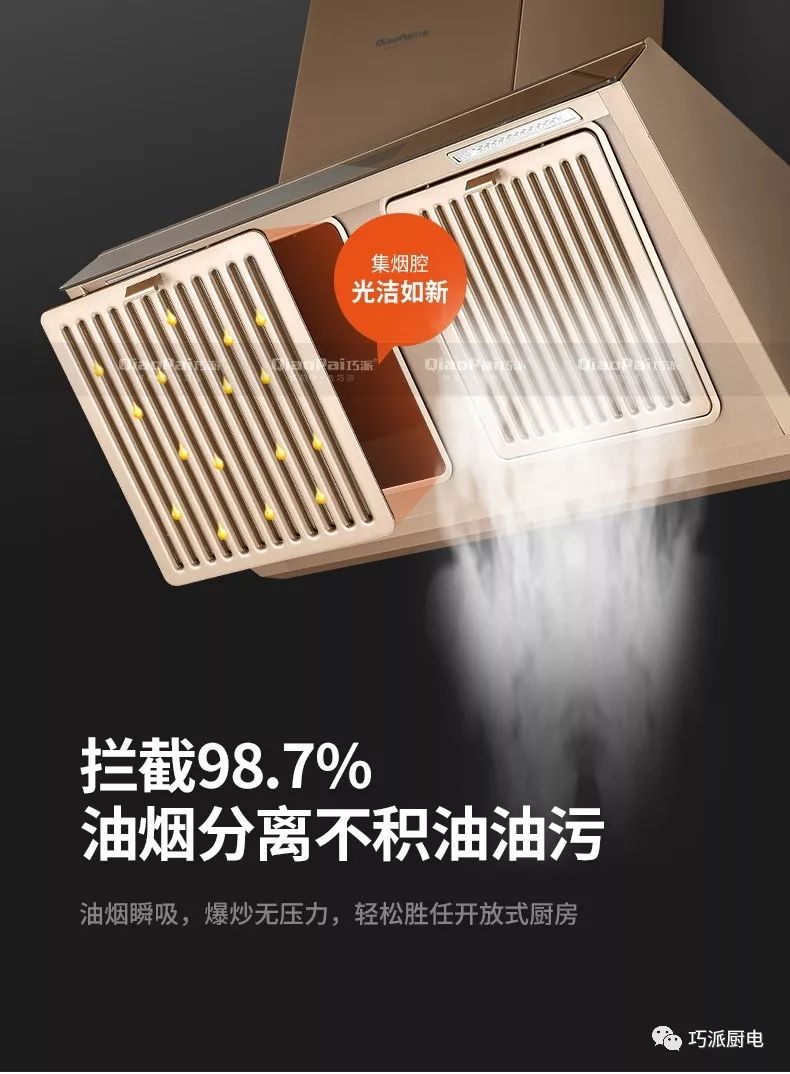 >不跑煙,不積油,不用洗 巧派廚電引領(lǐng)無煙廚房新時代 巧派M31S土豪金油煙分離油煙機 真正的油煙分離油煙分離時代已經(jīng)來臨。隨著油煙機技術(shù)創(chuàng)新與突破,油煙分離將被徹底引爆。在環(huán)保,健康的全民追求下,油煙分離已成為人人對油煙機的基本訴求。普通吸油煙機盡管解決了日常燒菜時的油煙問題,但煙機里堆積的油垢也是重要的污染源。美國環(huán)境工作組(EWG)研究發(fā)現(xiàn),吸油煙機機體內(nèi)沉積大量油垢,遇熱揮發(fā)后不僅會產(chǎn)生讓人極不舒服的氣味,同樣也富含大量致癌物質(zhì)。油煙分離伴隨著,免清洗,高氣味降低度,低污染的排放量的種種煙機功能的放大,似乎有一天,人們的無煙廚房的期望越來越近。