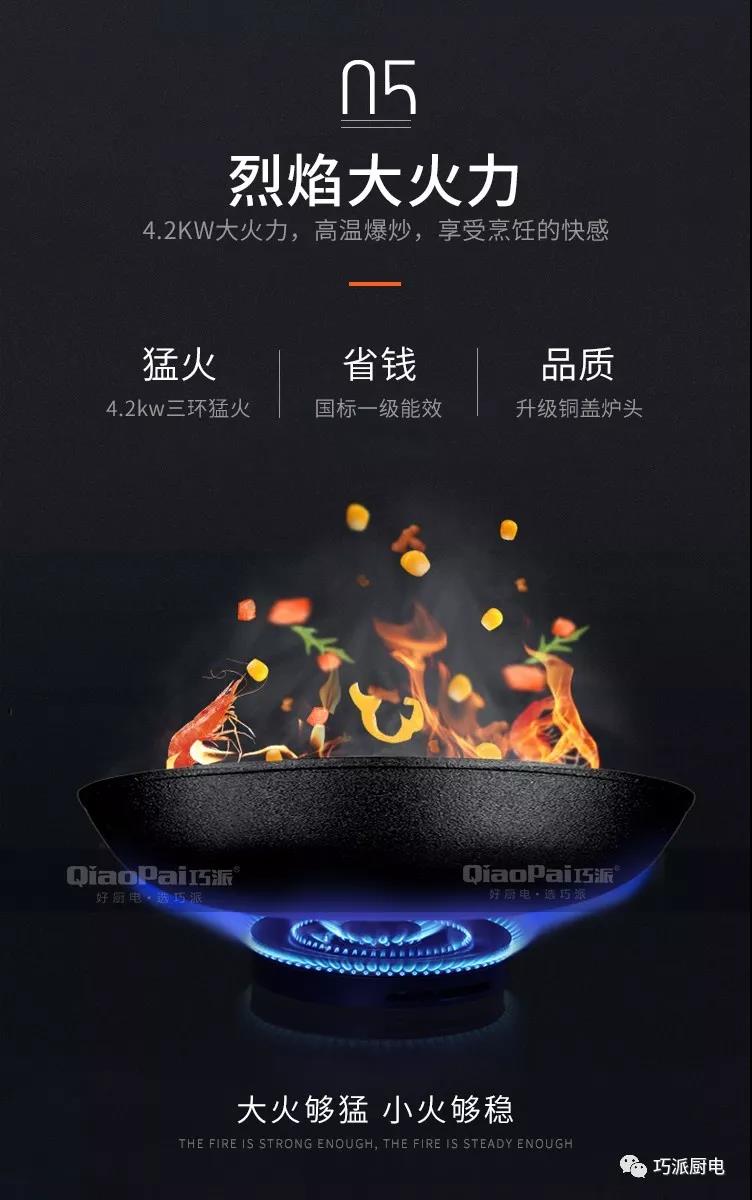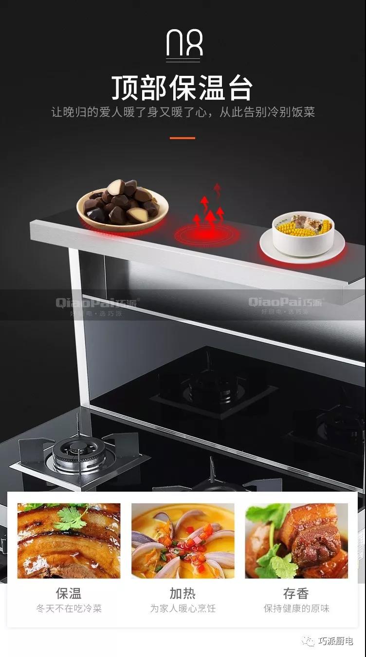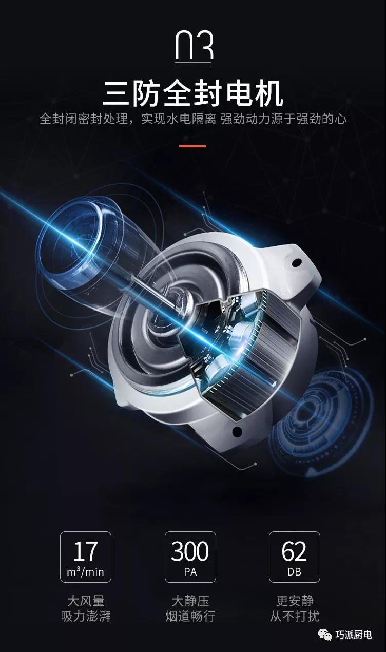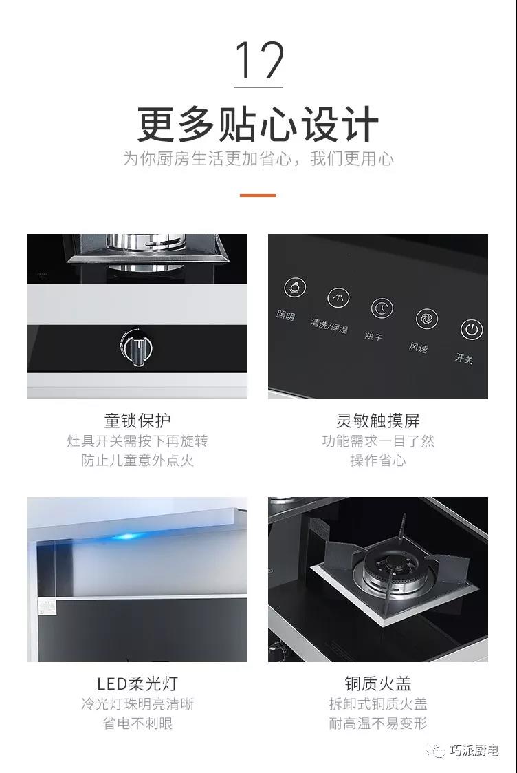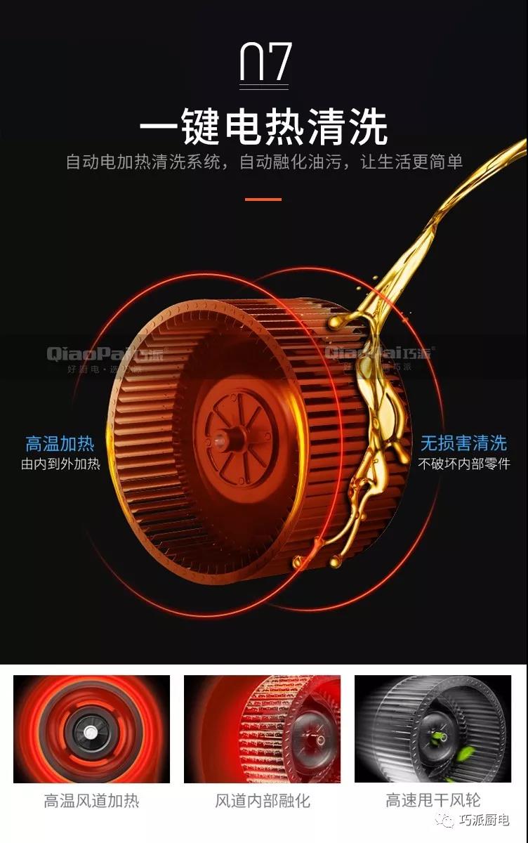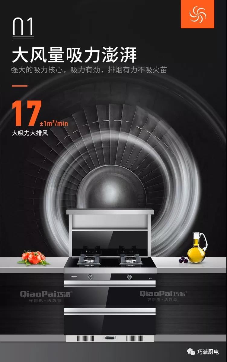 巧派集成灶的煙機(jī)使用近吸式結(jié)構(gòu),煙機(jī)與燃?xì)庠畹奈恢霉潭?,有效避免了傳統(tǒng)煙機(jī)因為安裝位置不當(dāng),導(dǎo)致油煙吸排效果不好的問題。煙機(jī)的吸風(fēng)口位于產(chǎn)品上部,距離灶具表面約450mm,比常見的頂吸式更靠近油煙生成區(qū)。